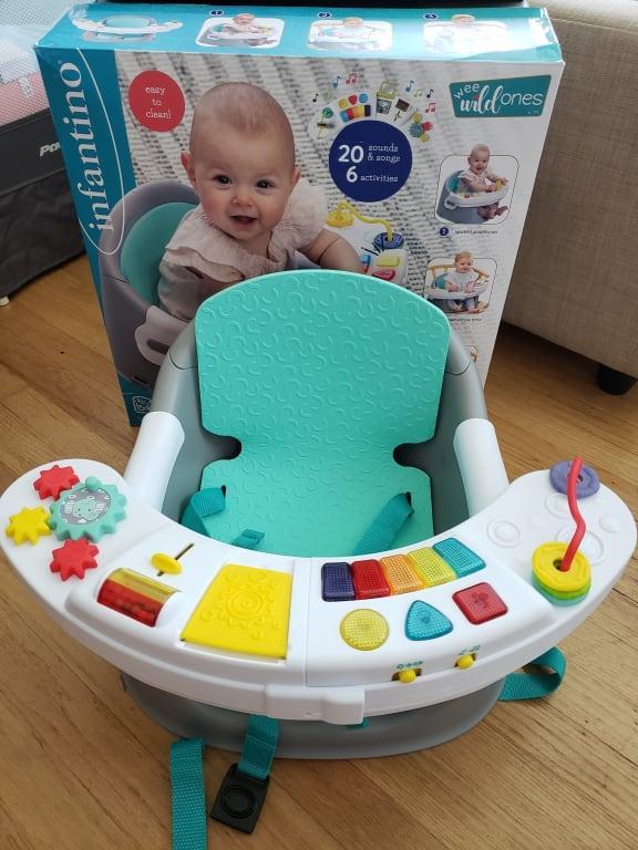 The Infantino Music & Lights 3-in-1 Discovery Seat and Booster supports early sitters in seat positioner mode, while keeping them happily engaged with 6 fun activities including a light up piano with 20 songs & sounds.